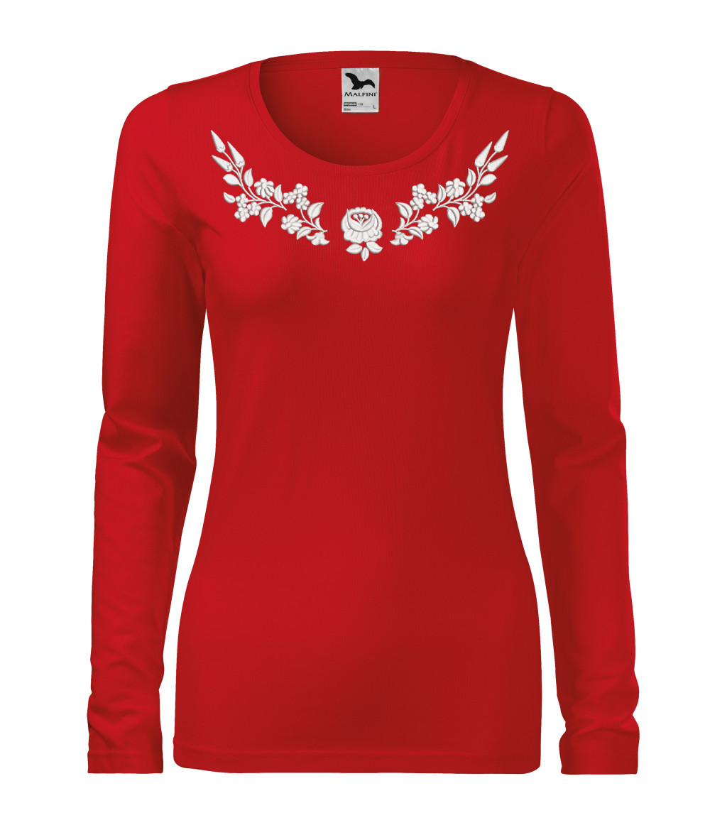 Hímzett, kalocsai mintás női, hosszúujjú piros póló fehér mintával L
