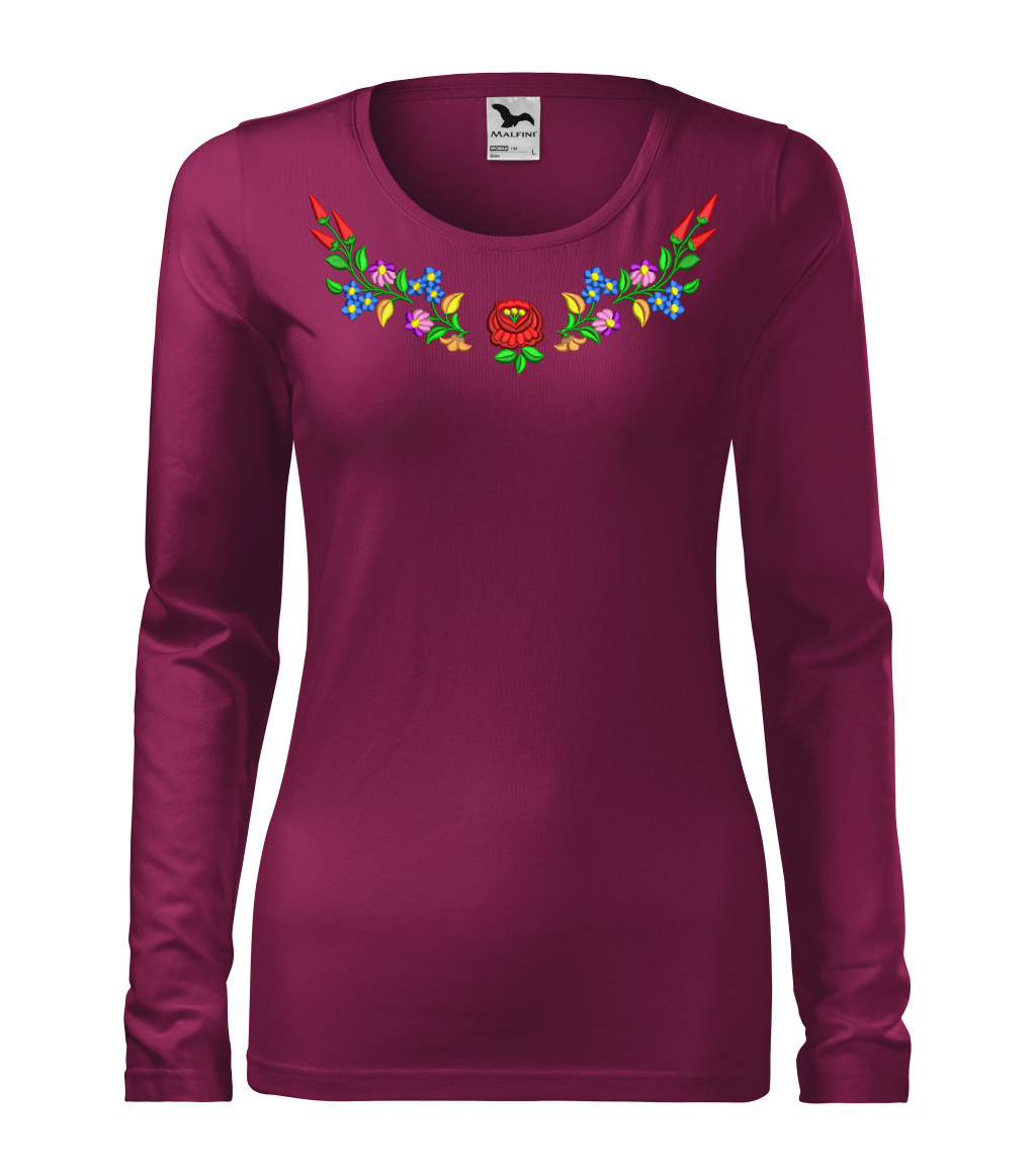 Hímzett, kalocsai mintás női, hosszúujjú bíbor póló színes mintával M