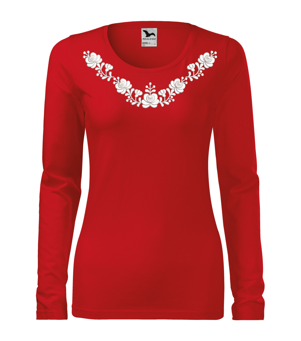 Hímzett, matyó mintás női, hosszúujjú piros póló fehér mintával M