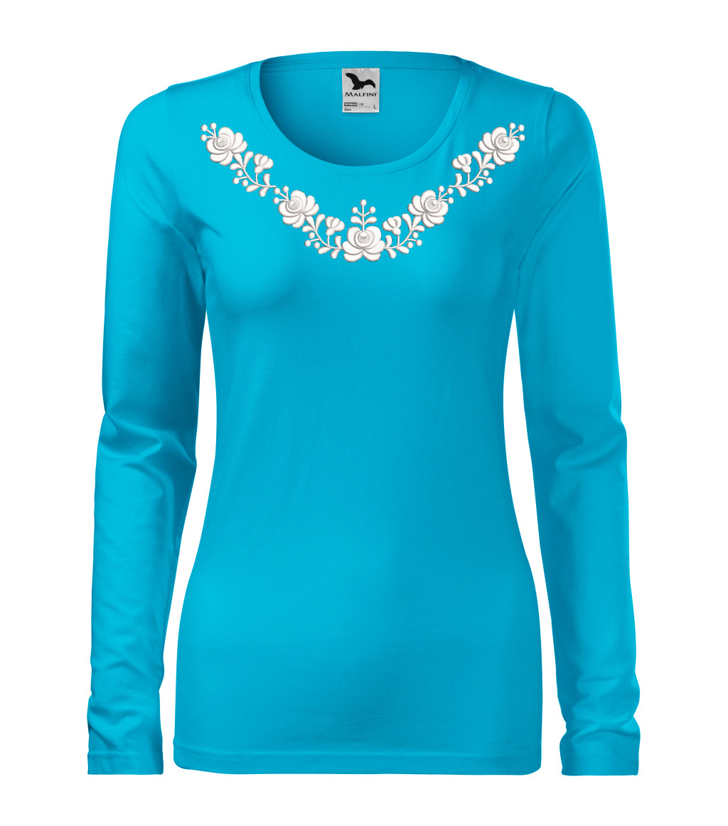 Hímzett, matyó mintás női, hosszúujjú türkizkék póló fehér mintával L