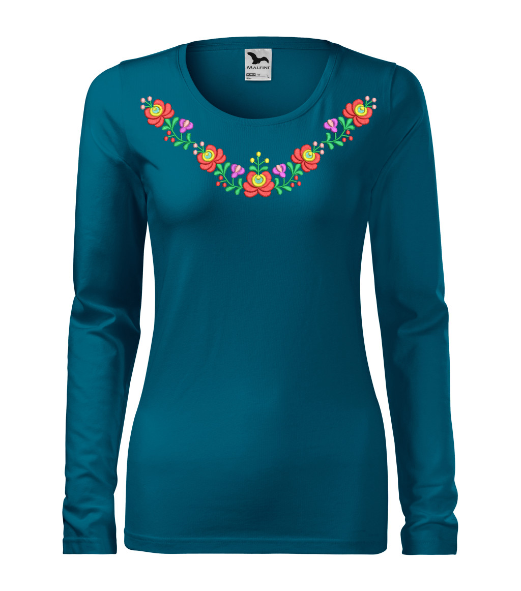 Hímzett, matyó mintás női, hosszúujjú petrolkék póló színes mintával M
