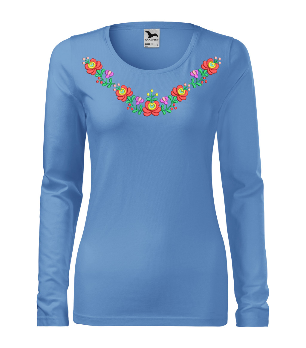 Hímzett, matyó mintás női, hosszúujjú égszínkék póló színes mintával XL