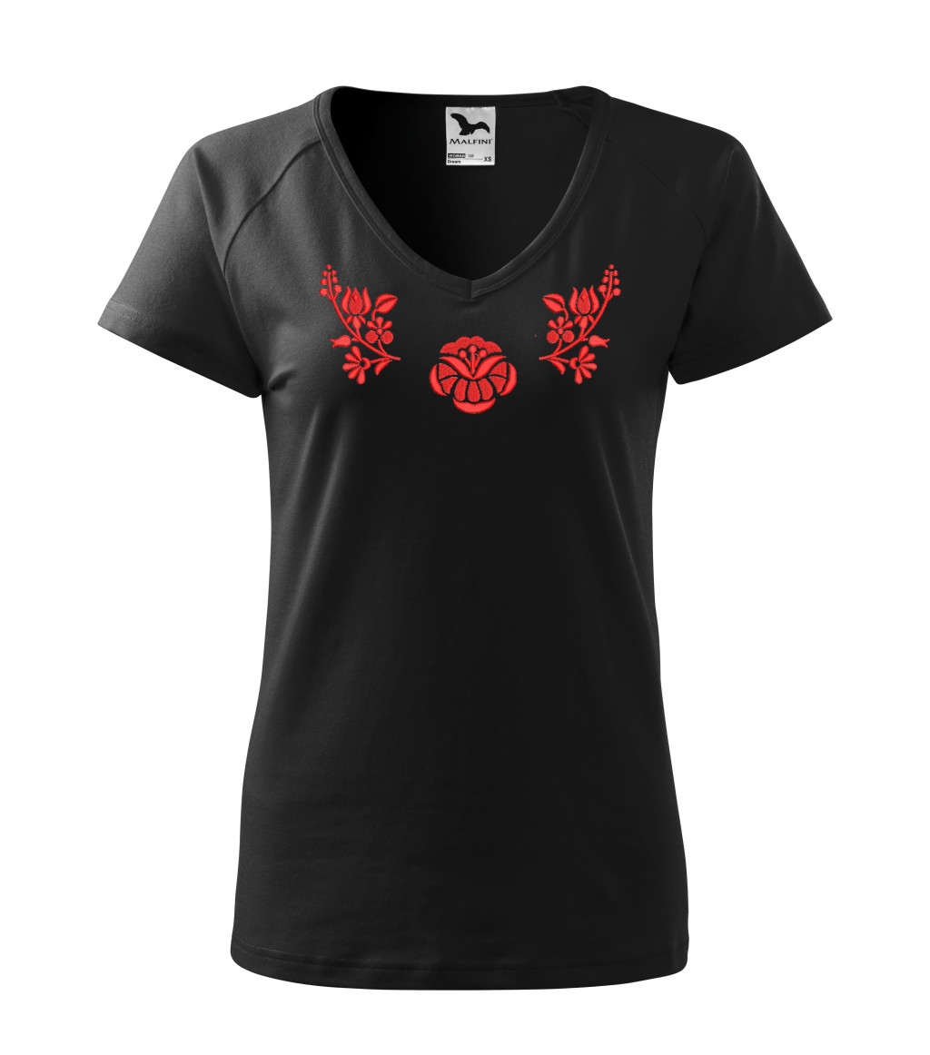 "V" nyakú hímzett magyaros póló, női fekete piros mintával 2XL